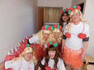 職員、利用者様がお地蔵様に扮し、いろいろなカツラの笠をかぶり大笑いと