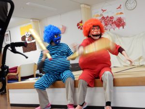 午前中2匹の鬼は『泣いた赤鬼』という昔話を元にした演劇を面白おかしく利用者様の前で披露してくれて、みんなの笑いをさらって行ってくれました。