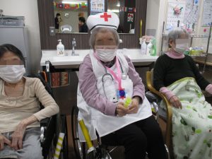 競技に参加した利用者様は、お題の書かれたカードを1つ選び、そこに書かれている『ナース』や『マッチ売りの少女』や『大阪のおばちゃん』といったお題の扮装をして、みなさまに披露するというものです。