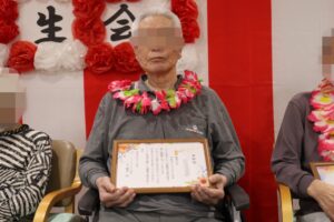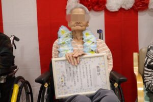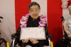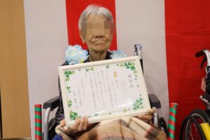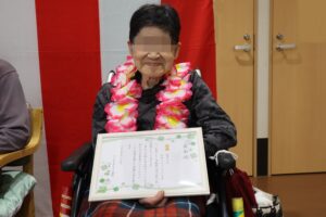 対象のご利用者様に賞状をお渡しし、皆さんでお祝いをしました。